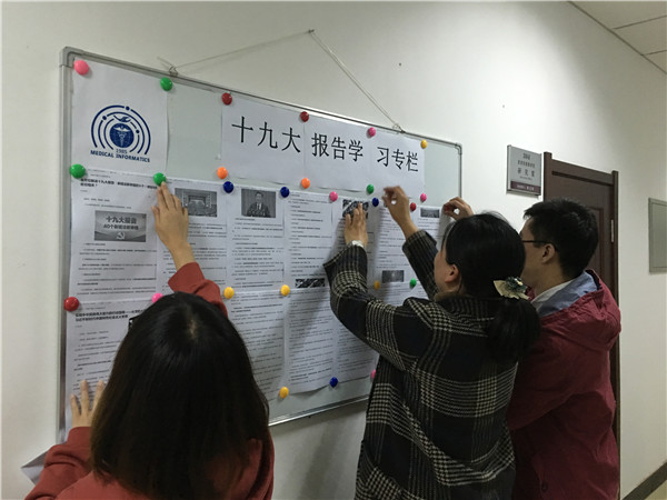 医药信息学教工党支部在系会议室举办了十九大精神专题学习活动,通过集体学习和讨论,进一步深入领会十九大报告精神,共同憧憬党和国家未来的大政方针。会后,经全体党员的共同提议,在学系开设了“十九大报告学习专栏”,加大宣传力度,为全系师生学习十九大精神提供支持。