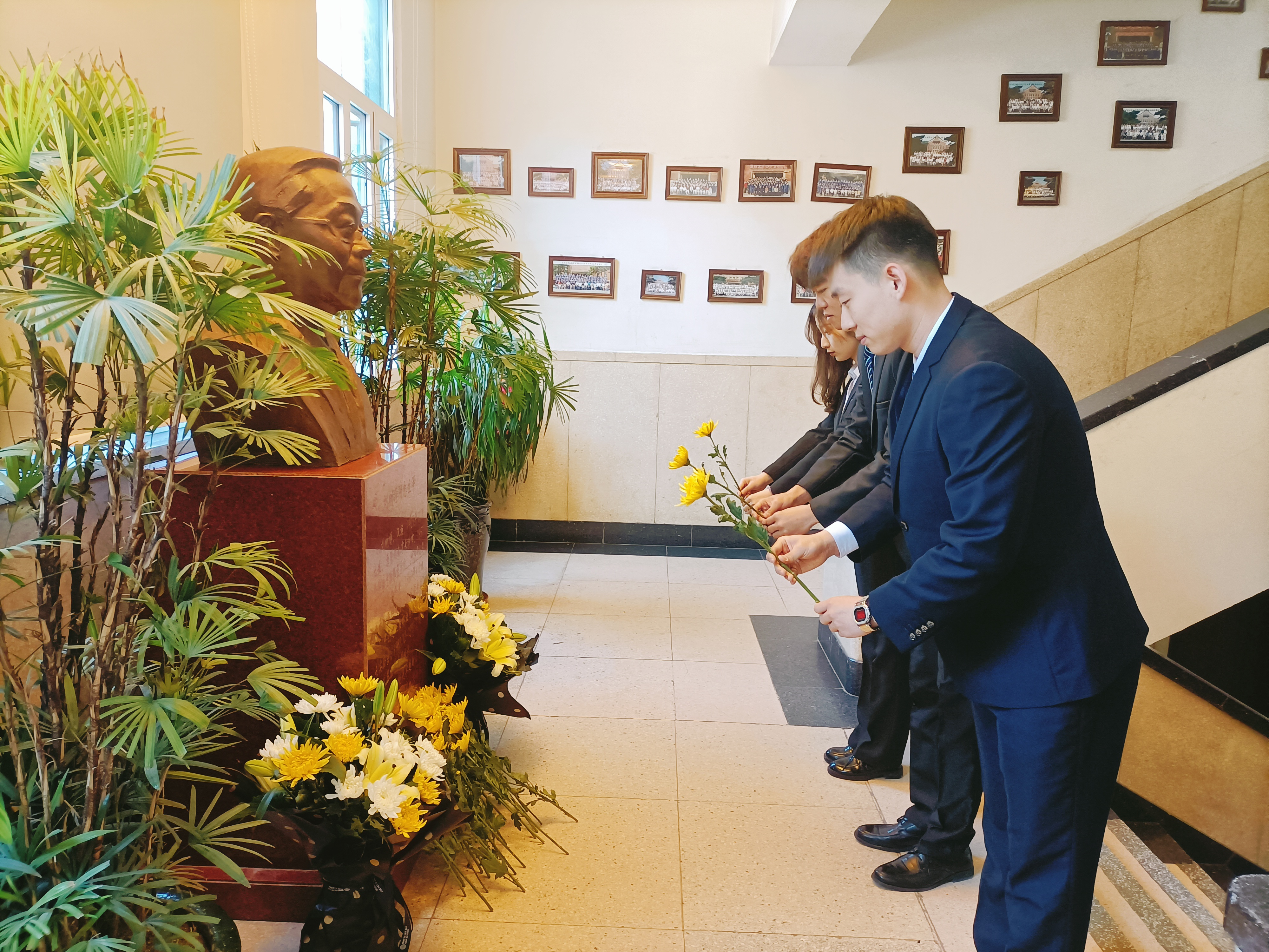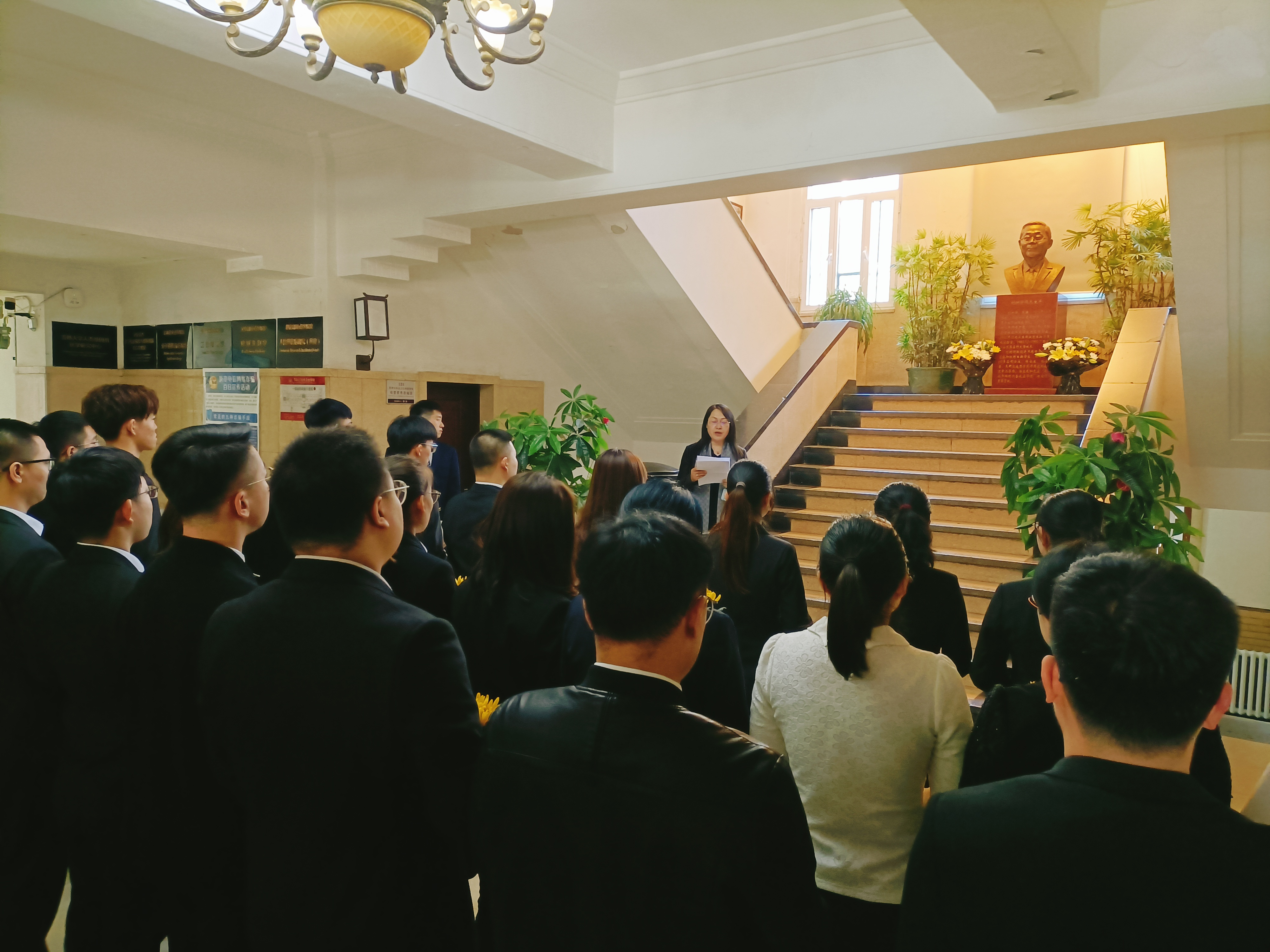 首先,放射生物教研室主任金顺子老师作为教师代表发言,她简述了刘树铮先生的生平事迹,其中着重介绍了先生为学院做出的突出贡献,情真意切的话语中流露出对刘树铮先生的缅怀之情,她勉励同学们向刘树铮先生学习,传承弘扬先生的精神风骨。接下来,由学生代表李智鹏同学发言,他从青年学生视角出发,为同学们讲述了他眼中的先生形象,号召青年学生应继承先生遗志,传承先生思想,为国家公共卫生和放射医学事业奉献终身。发言结束后,学生代表上前祭扫了刘树铮先生雕像。祭扫完毕,全体师生代表依次来到刘树铮先生雕像前庄严鞠躬并敬献花束。