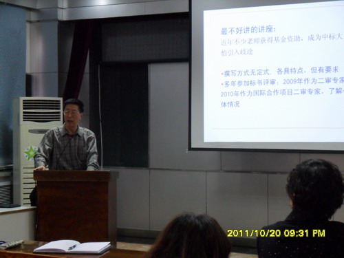 首先,李才教授根据多年来自己申请自然基金项目和作为专家评审自然基金项目的经验,从“选题原则;突出创新性;如何写好标书;高质量申请书的特点。”四个方面进行详细的剖析和讲解,使与会者对自然基金的申请有了深刻的启发和认识。李娟教授以“我的科研工作入门”为题,结合自己承担自然基金项目和十一五科技部重大项目的体会,深入浅出地介绍了申请项目中的技巧、经验及注意事项。最后,院长于雅琴教授对会议进行了总结性,鼓励广大教师积极参与科研工作并提出相关要求。