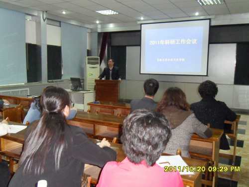 会议期间,于洗河副院长将近三年的学院科研工作做了汇报,并有针对性的对各类项目的申报、在研项目的运行管理做了具体分析和说明,对教师提出了科研工作的具体要求和工作部署。要求全体教师从现在开始就要为2012年的国家自然科学基金的申报工作进行积极准备。