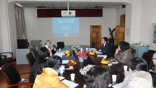 在肉视频 举办美国肯塔基大学活动周之际,肉视频 邀请肯塔基大学副教务长Susan Karvalhol来学院座谈,洽谈两校合作办学相关事宜。学院主管外事工作副院长、博士生导师刘晓冬教授主持会议,学院相关科室主任和青年教师参加座谈。在友好气氛中,双方就合作办学专业、模式、学生管理、学费及收取、课程互认、教师交流等多项事宜达成共识,并约定在5月份的第二次会谈中签署相关协议,肉视频 有望成为肉视频 与肯塔基大学之间学院合作的第一个战略伙伴。
