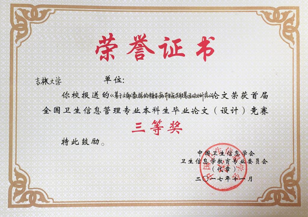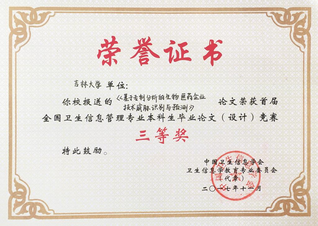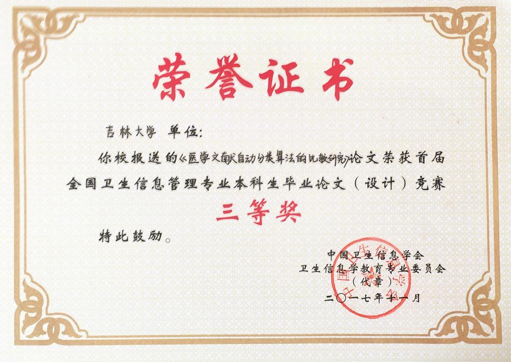 从2017届信息管理与信息系统(医药信息管理)专业本科毕业论文中选送参赛论文9篇,其中《用户主题熟悉度对查询重构行为的影响及熟悉度预测》(刘强,指导教师:孙丽副教授)获本次竞赛一等奖;《基于专利分析的生物医药企业技术威胁识别与预测》(李芳芳,指导教师:王伟教授)、《医学文献自动分类算法的比较研究》(张雅鑫,指导教师:张云秋教授)、《基于文献数据的糖尿病并发症关联基因对比研究》(金姗,指导教师:牟冬梅教授)分别获得本次竞赛三等奖,获奖论文数量位列参赛各院校首位,比较客观地反映了肉视频