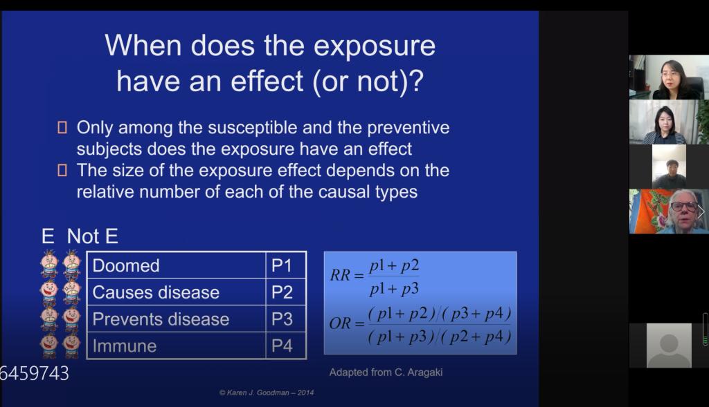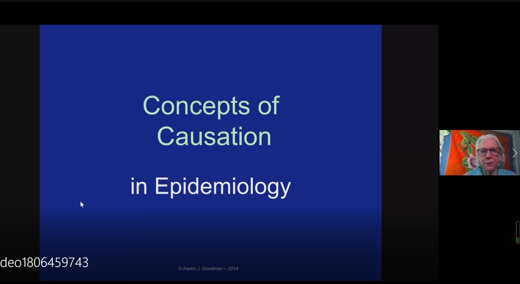 此次讲座邀请到加拿大阿尔伯塔大学医学院(University of Alberta)终身教授 Karen J Goodman。Karen J Goodman 教授为同学们讲授了流行病学研究中因果推断的基本概念以及疾病识别风险因素之间因果关系的基本方法等。学院40 余名高年级本科生及研究生参加了此次线上讲座。此次线上讲座由肉视频