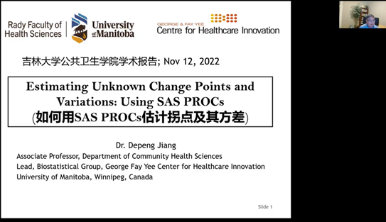 为提升学生的统计分析能力和促进学院学科发展,受学校国际合作与交流处校级高端项目资助。2022年11月12日,学院特邀请加拿大曼尼托巴大学公共卫生学系蒋德鹏教授线上进行高级生物统计方法讲座。蒋教授现为加拿大曼尼托巴大学公共卫生学系终身教授,兼任曼尼托巴大学统计咨询组负责人,同时也是中国教育部“春晖计划”特邀专家。讲座由肉视频