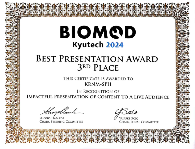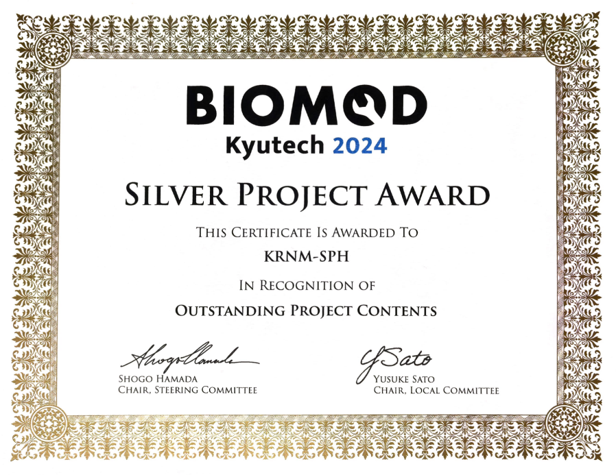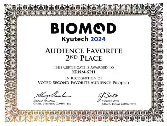 KRNM-SPH代表队获得2024国际大学生生物分子设计大赛(BIOMOD)银奖、观众最喜爱奖(Audience Favorite)第二名、最佳汇报(Best Presentation)奖第三名。本届大赛由日本分子机器人研究组主办,九州工业大学承办,旨在促进生物纳米材料应用,推动世界大学生之间的交流与创新。