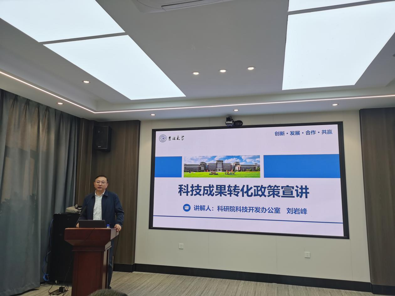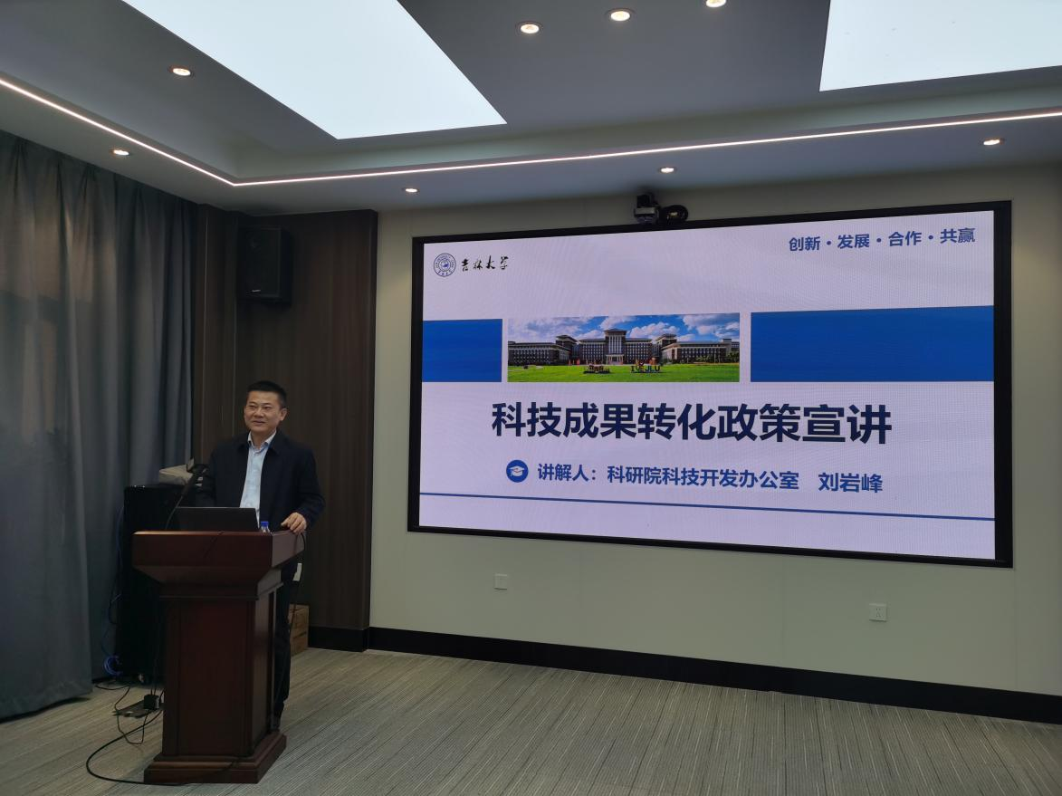 邀请科研院副院长兼科技开发办公室主任、国内合作处处长刘岩峰作科技成果转化政策宣讲会,技术转移科科长徐婉、朱梓瑞老师、肉视频