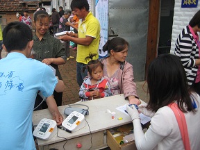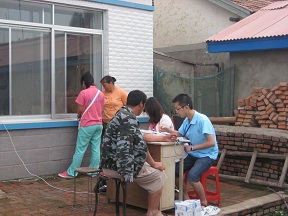 通过队员们的互相配合,工作到了12点半左右就结束了,几个小时的持续战斗让我们都疲惫不堪,队员们甚至连口水也没来得及喝、汗也没时间去擦,声音也沙哑了,但是大家谁都没有怨言,我们很快乐很荣幸能为居民献出一份力。次日,农民健康体检服务团队来到了亚太水泥厂职工医院,计划给职员们做调查和体检。前一天的经历使我们信心满满,可是预约的情况并不像想象的那么好,职工来的并不是很多,但经过志愿者的积极努力,由原来的集中调查变为“穿街入户”宣传,调动更多的农民朋友参加到健康体检中来,活动最终取得圆满成功。这次“双阳之行”很苦很累,但乏味中充满着希望,苦涩中流露着甘甜。