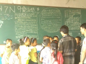 绘制板报前,志愿者带着学生一起查资料,筛选出要用到的内容,并且在草纸上绘出板报格式、图案、花纹等,大家广泛参与,集思广益,决定出板报的最终样式开始绘制。绘制过程中也是热闹非凡,大家你递格尺我拿板擦,粉笔传来传去,有的绘图有的写字,忙的不亦乐乎。