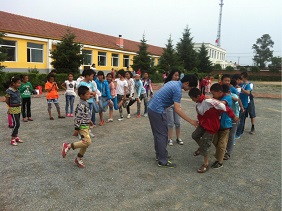 志愿者通过两天的接触,深感农村孩子的知识贫乏与对知识的渴望,为了启发学生对英语学习的兴趣,养成快乐学习的良好习惯,学会学与玩相结合,夏令营的第三天,志愿者们为小学生准备了英语学习与团队协作的游戏。
