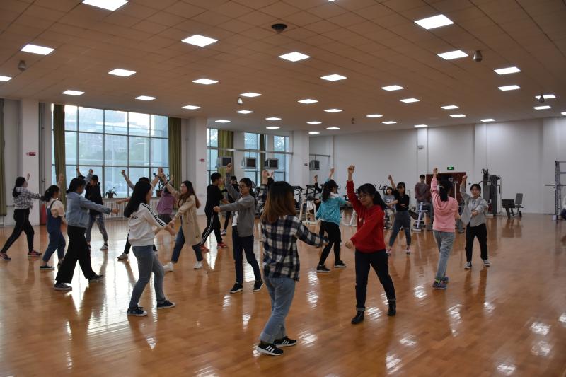 新民校区体育馆健美操室进行广播操、啦啦操集训。