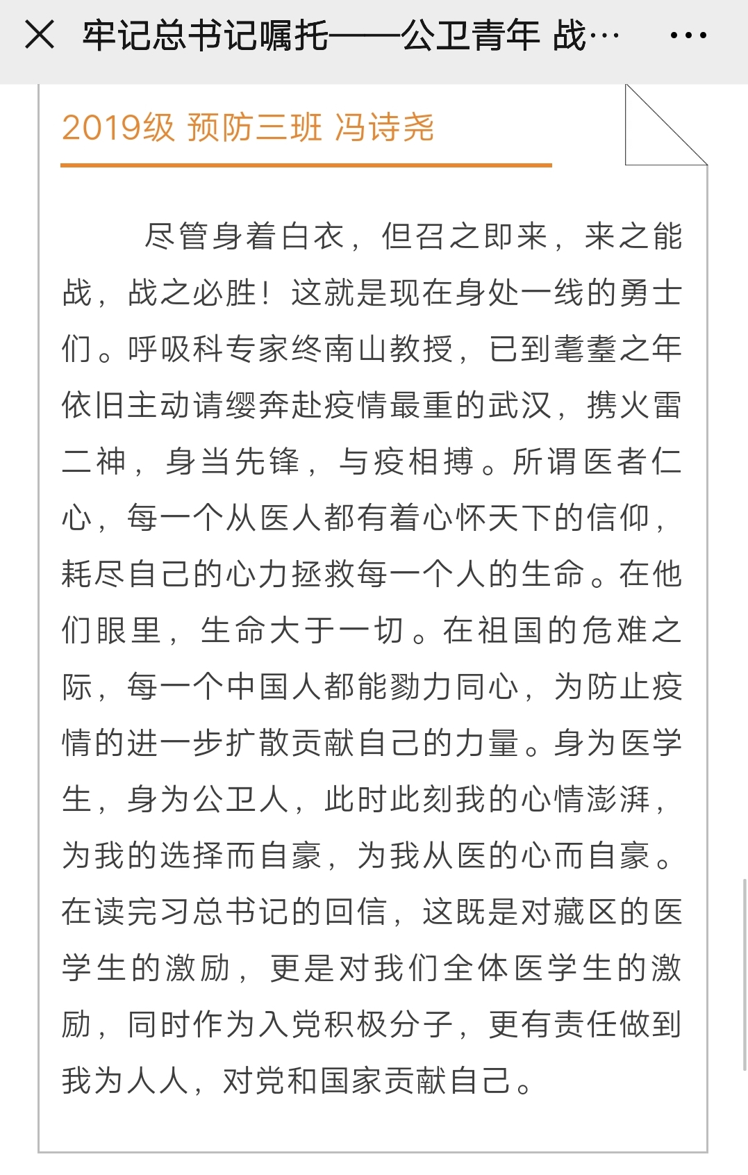 团委组织部开展“牢记总书记嘱托——公卫青年战疫在线”系列活动,号召同学们通过多种形式,积极参与到全民抗疫的工作中,用实际行动诠释医学生的责任与担当。肉视频