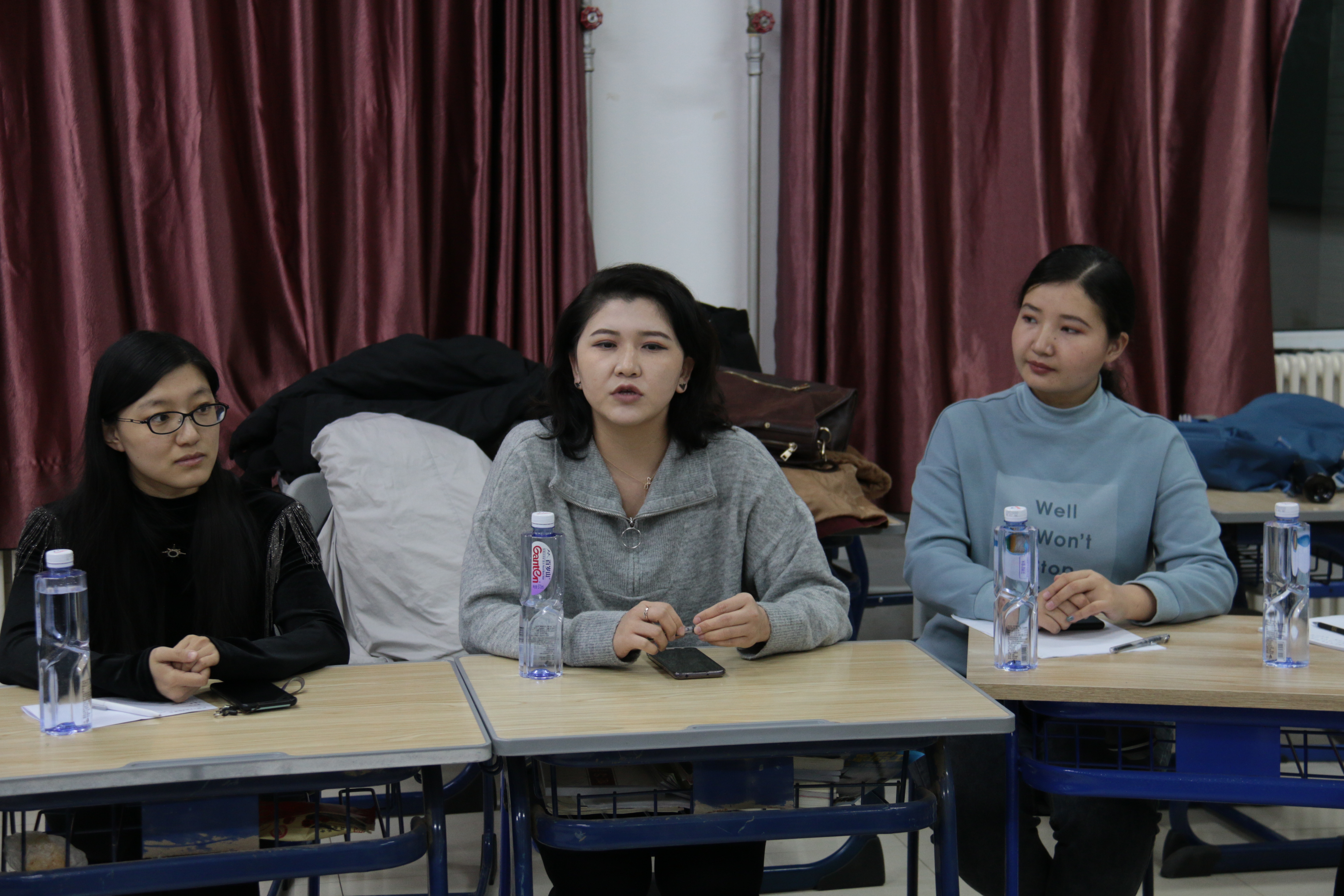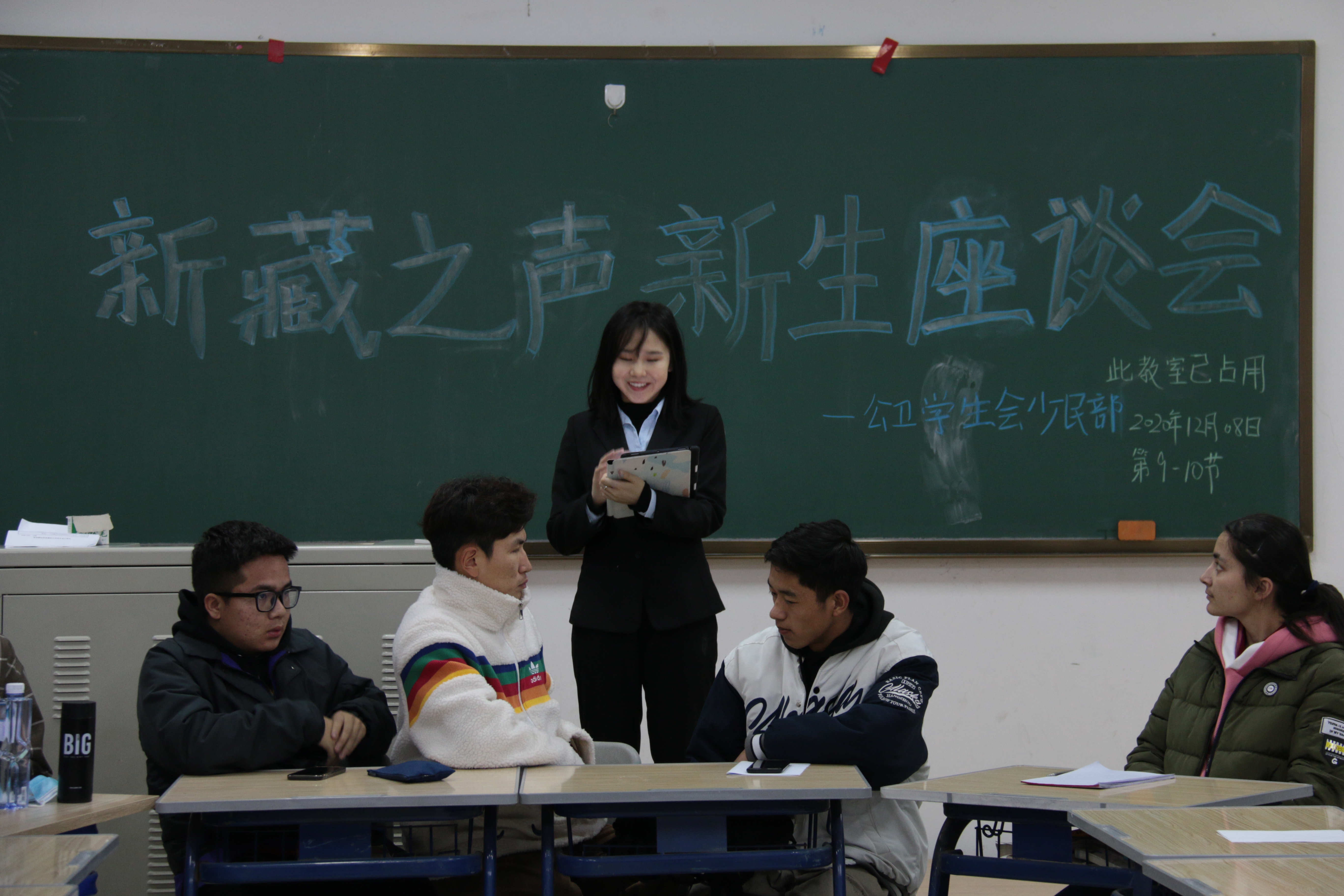 于12月8日在中心校区李四光教学楼114教室举办“新藏之声”少数民族新生座谈会。邀请各年级优秀少数民族学生为新生们分享经验,党委副书记兼副院长刘丽,辅导员霍睿、冷贺璇、姜姗姗、刘心怡老师出席会议。
