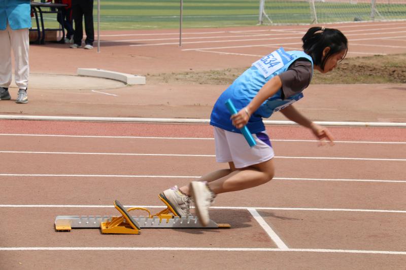 本次女子4×100米接力赛决赛于5月28日下午一点半正式开始。位于1组5道的四名同学检录后提前到场,做好充分的热身训练,在指定位置预先设想好交接动作,争取又快又准地完成接力棒的交接。随着裁判一声枪响,一号选手周陈佳冲了出去。观众席上的鼓声不断、加油声不断。选手的热情也被这氛围点燃,一步一步地向前跑去,同时也不忘呼吸与频率的协调。在一百米即将结束时,周陈佳伸出拿着接力棒的手,二号选手初加仪也提前做好准备姿势。一根接力棒,是活动道具,更是不同人两只手同时握住的责任、无声鼓励。没有犹豫,初加仪冲了出去。然后是三号选手李昕如,四号选手韦海玉。红色的跑道承载着运动员的汗水与泪水,她们置身于此情境中,一心只有白色的终点线。跑过终点线,才又回归现实,收获观众们的喝彩声。肉视频