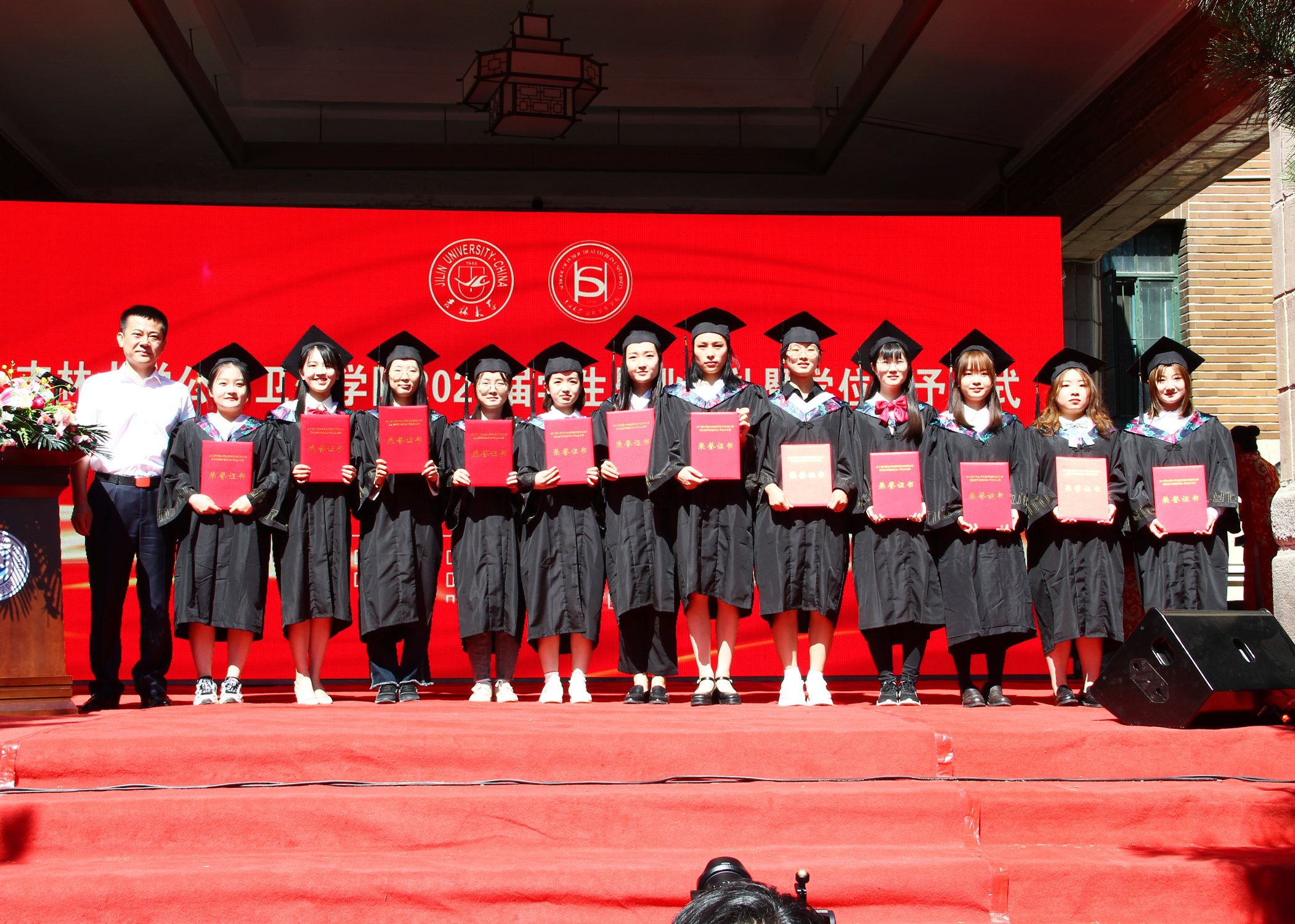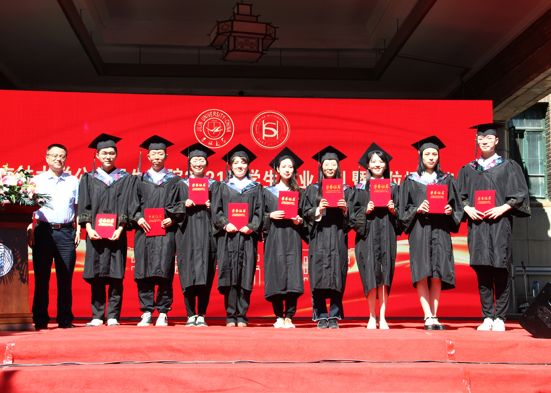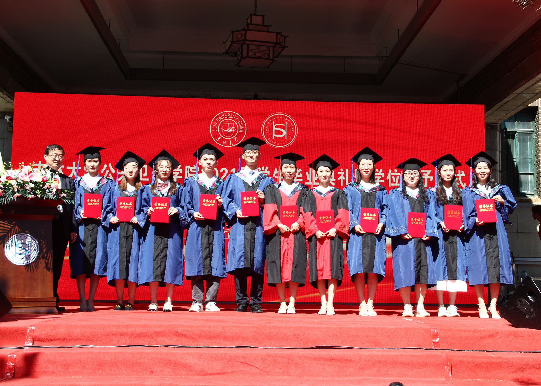 伴随着庄严的国歌声,毕业典礼正式拉开序幕。寇长贵宣读了第十届中国大学生医学技术技能大赛预防医学专业赛道东北华北赛区喜报及获奖学生名单、2021届本科毕业生学士学位授予决定及优秀本科生毕业名单。于洗河宣读了2021届硕士、博士学位获得者名单及优秀研究生毕业生名单。随后,魏国志、刘晋宇、赵国利分别为优秀本科生毕业生、优秀研究生毕业生、第十届中国大学生医学技术技能大赛预防医学专业赛道东北华北赛区一等奖获奖学生颁发荣誉证书。紧接着,李娟和刘雅文一同为毕业生授予学位,颁发学位证书并合影留念。