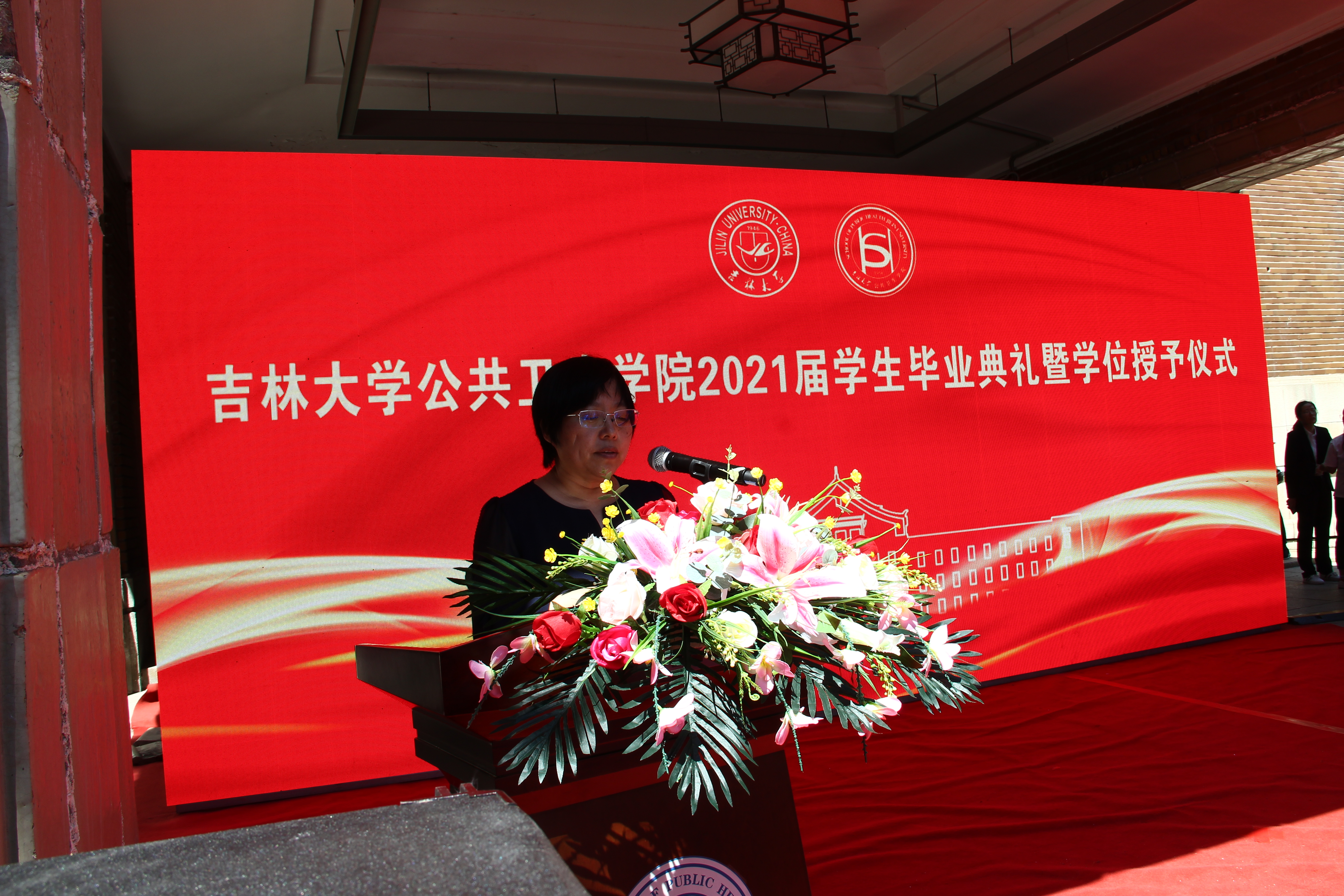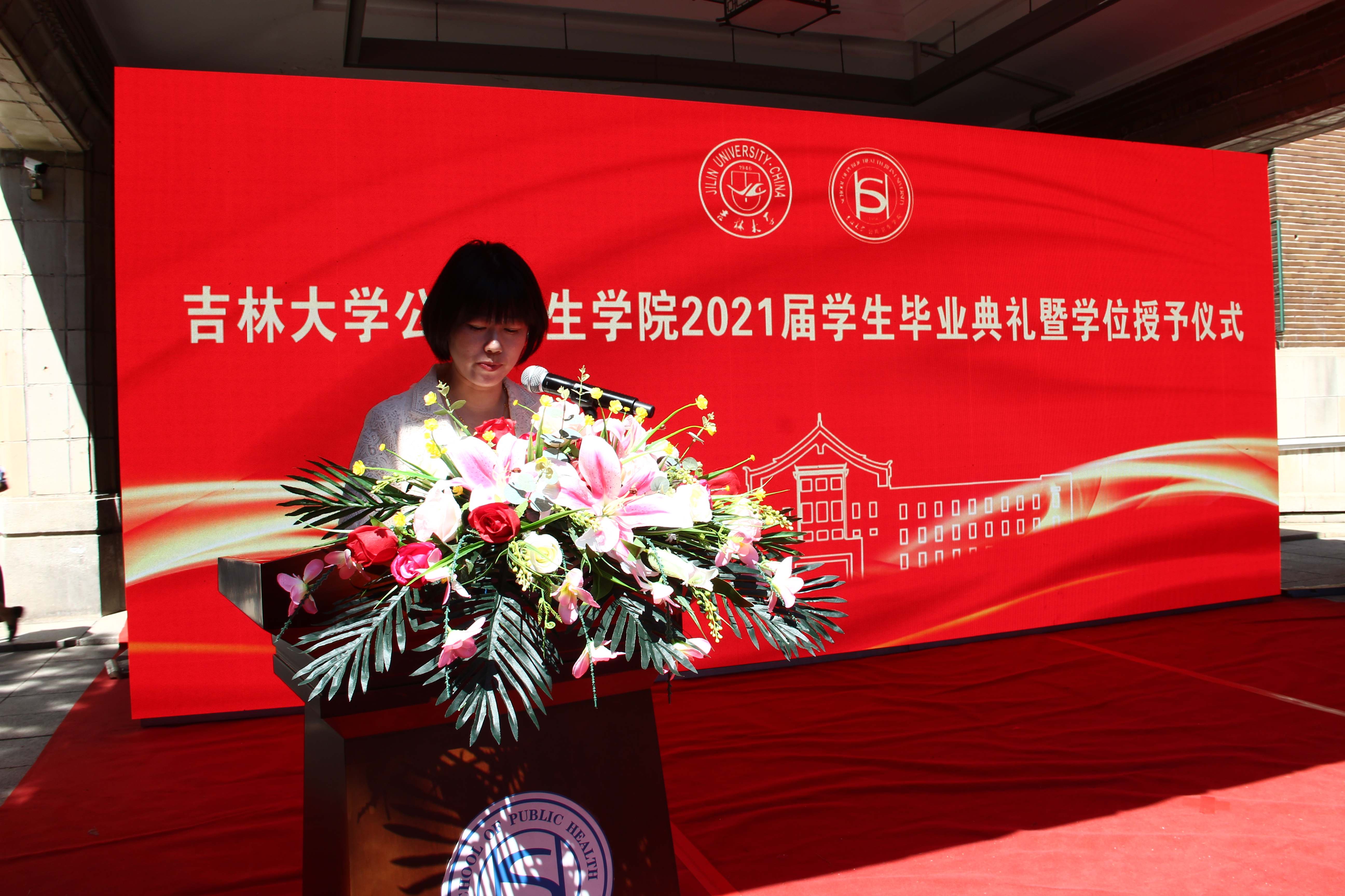 典礼的最后,刘雅文上台致辞。首先,她再次代表学院向毕业生们致以热烈的祝贺和衷心的祝福。她向全体毕业生提出三点期望:一是要有立己达人、兼济天下的社会责任感;二是要有终身学习、永不懈怠的学术信念感;三是要有敬佑生命、心怀大爱的职业道德感。她勉励全体毕业生无论身在何处,都不要忘记自己的“根”和“魂”,记得母校的重托和公卫人的使命,不负韶华,勤奋工作,接过未来人类战疫的接力棒,为国家未来医疗健康事业奉献青春。