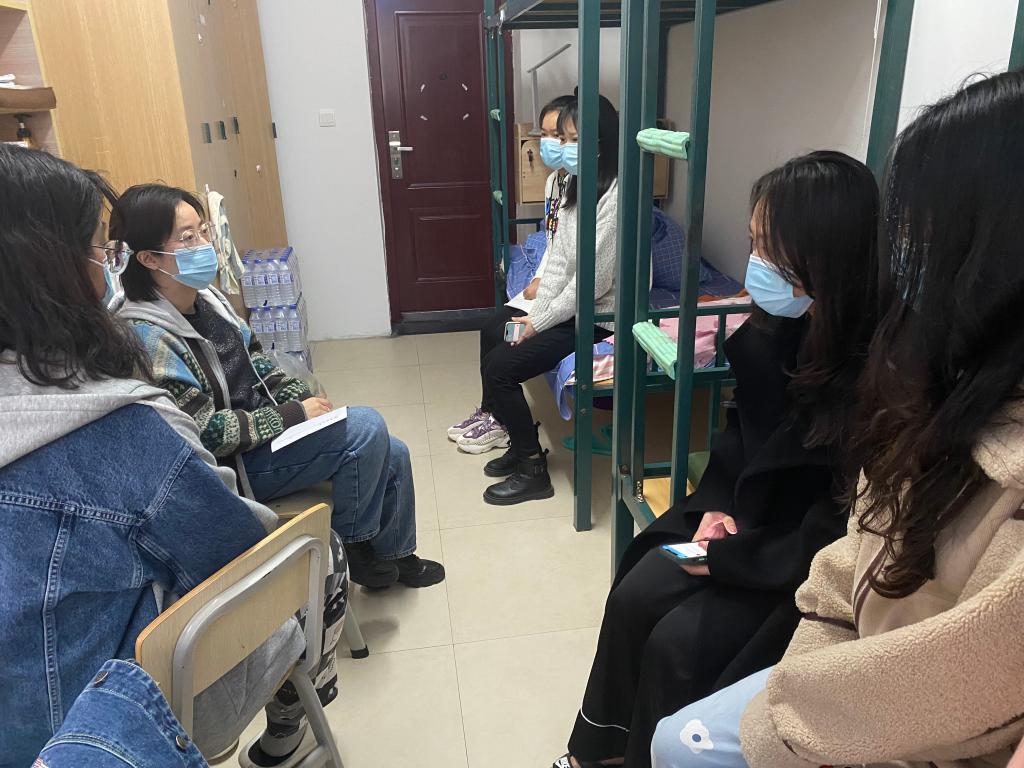 众志成城、共克时艰、人人有责。经过前期商讨和研究,学院以学生情绪安全稳定为重点,以成立应急志愿者专班等工作为抓手开展相关工作,确保住楼相关工作平稳顺利:一是紧急成立公寓封闭管理微信通知群,传达学校相关要求和消息,做好疫情通报和防疫工作安排,希望同学们不要恐慌,平稳学生情绪。二是成立志愿者服务专班,负责餐、水等物资发放及分配等工作,叮嘱志愿者提高消毒意识和科学佩戴口罩等工作细节,做好楼层间纵向转运和楼层内横向分配,确保精准配送到人。三是发挥党员先锋模范作用,成立公寓党员抗疫先锋队,要求党员同志提高政治觉悟、发扬奉献精神,在疫情关键时刻站出来,做好公寓楼同学发烧、隔离等突发事件的协调处置及后期核酸检测等工作的预案,切实履行党员职责和义务。四是开展辅导员走寝,摸清公寓楼在楼人数和隔离、治疗等同学底数,做好配餐的实时统计,重点就少数民族同学和就医同学人群进行分类统计,畅通学生与辅导员的沟通渠道,做到工作精心,学生暖心。五是根据公寓封闭的实际情况,进行安全防火大检查,对防火通道相关堆积物品、寝室电线较乱等情况进行整改,做好相关同学的解释工作,确保公寓安全稳定。