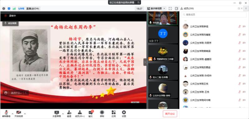 刘信君教授通过生动形象的历史故事,为同学们讲述了“南杨北赵东周西李”、陈翰章、赵一曼等东北抗联英雄在战争中所表现的伟大抗联精神,并介绍了在全国抗击新冠肺炎疫情表彰大会上,习近平总书记精辟概括并深入阐释的伟大抗疫精神。刘信君老师用深入浅出的语言、历史与现实相结合的方法,讲述了东北抗联精神与当下全国齐心抗疫精神的内涵与外延。