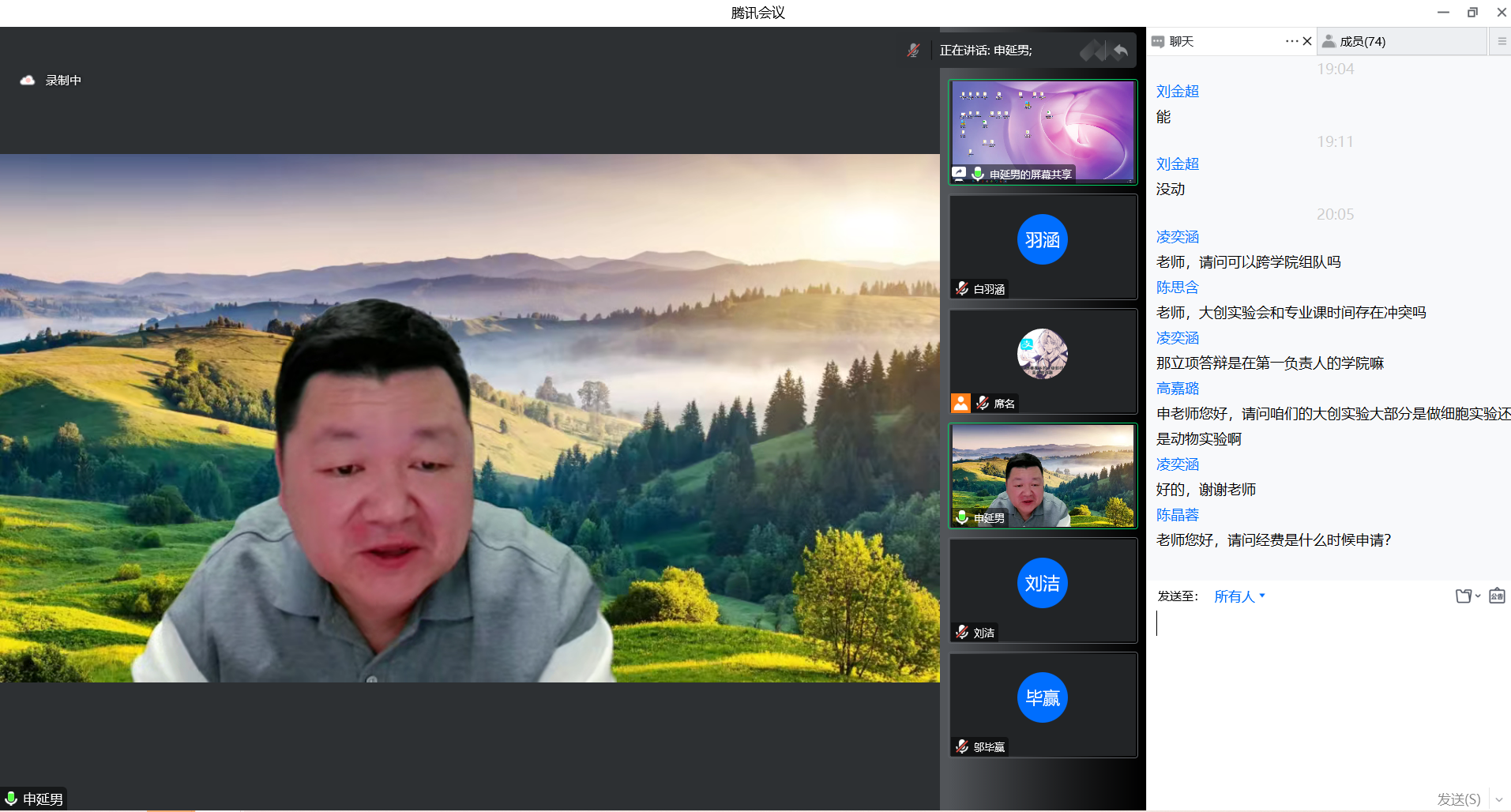在此次会议中,申延男教授首先从大创是什么、大创的类型、大创的申请与审批流程三个方面进行了介绍,使同学们对大创有了更加清晰的认知,并强调了作为医学生应该更加注重实践环节。之后,申延男教授又依次介绍了各位放射医学系的教师、重点实验室基本情况、重点实验室“十三五”期间科研工作情况、代表性研究成果与贡献、研究队伍建设和青年人才培养、实验室条件建设、开放及学术交流情况,最后,申延男教授对同学们提出的问题进行了详细的解答。至此,肉视频